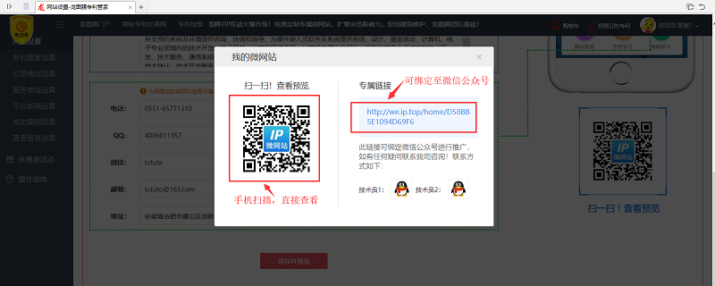 2. 填写正确信息后,点击页面底部的保存并预览按钮。可以生成微网站二维码和微网站链接。(二维码可以直接用手机扫描查看,链接可以绑定到微信公众号,或者直接在手机浏览器查看。)