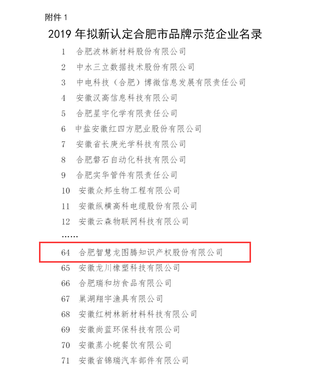 合肥智慧龙图腾知识产权股份有限公司被认定为 合肥市品牌示范企业公示文件