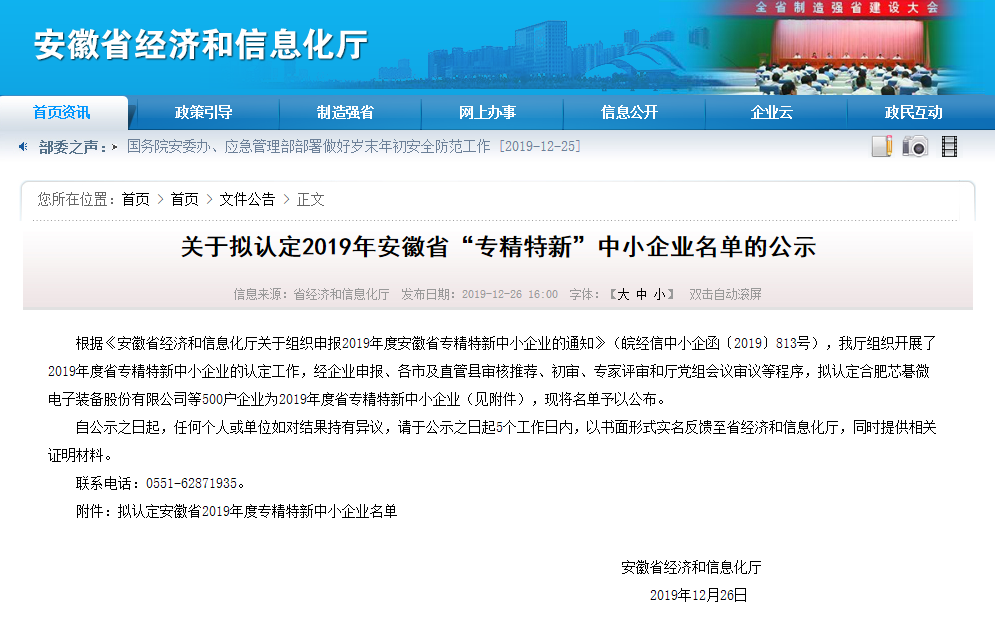 2019年12月24日,2019年度合肥市品牌示范企业认定名单公示,龙图腾光荣登榜,获得殊荣!12月26日,安徽省经济和信息化厅公布了2019年度安徽省专精特新中小企业名单,龙图腾再次获评!