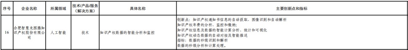 为加快新型基础设施建设,以新基建助力新产业发展,5月27日,安徽省正式发布新型基础设施建设领域技术产品服务目录。首批目录共896项,主要包括5G、人工智能、工业互联网、数据中心、超算中心、物联网等领域的新技术、新产品、新服务。 本批次合肥智慧龙图腾知识产权股份有限公司的“知识产权数据的智能分析和监控平台”作为人工智能项目入选。