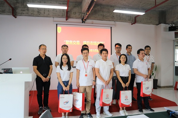 买专利卖专利找龙图腾,真高效! 查专利查商标用IPTOP,全免费!专利年费监控用IP管家,真方便! 09月11下午,09月份主题营销例会在龙图腾凌霄殿大会议室举行,会议主题为“聚焦交易,提升市场比例”。会议由业务部总监王慧慧主持。 会议开始,由刘总亲自为荣获龙图腾公司8月份创新奖的获奖人员颁发荣誉证书及奖品,并合影留念。