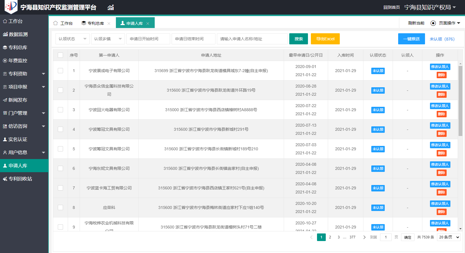 三、申请人库 申请人库可以管理维护本区域内的申请人,具体划分申请人地址等。在列表中,直观显示,方便管理员直接查看。