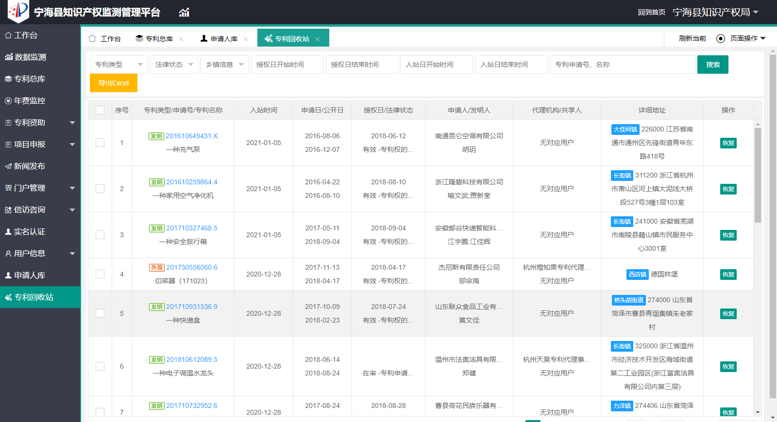 四、回收站 回收站主要用于管理用户转移出来的专利,可以一键恢复专利至专利库。对于转移的专利数据,有记录可查找。