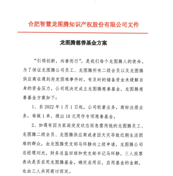 “引领创新,向善而行”,是我们每个龙图腾人的使命。为了保证龙图腾公司员工、龙图腾所有二级会员以及龙图腾供应商在遇到突发困难事件时,有及时的储备资金来缓解自身的资金压力,公司现决定成立龙图腾慈善基金,龙图腾慈善基金方案如下: